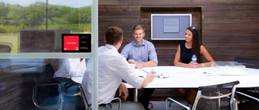 Pantallas touch ligadas al servidor de correo corporativo para simplificar la reserva de salas y espacios de uso compartido.